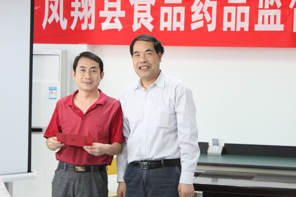 參加典禮的有西北農林科技大學張建新教授、陜西科儀陽光檢測經理穆登峰、實驗室主任劉永建、鳳翔縣食品藥品監督管理局專業技術人員等13人。首先張教授對此次培訓發表總結講話,其次陜西科儀陽光檢測穆經理與張教授一同為學員們頒發了培訓證明:
